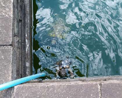 今朝の亀さんたち、やっぱり亀男さんはちょっとシャイです。亀子さんはいつものように壁をよじ登ろうとして餌をねだっています。個性豊かな亀さんたちです。(副校長)