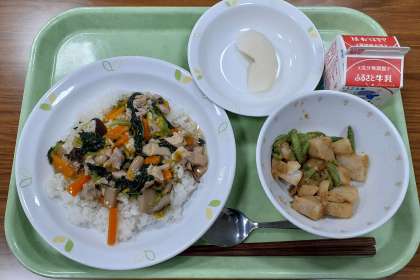 菊の餡掛けご飯は、明日、9月9日が重陽の節句(菊の節句とも言われ、菊を用いて厄払いや長寿祈願をするそうです)にちなんでいます。菊の花、小松菜、エリンギ、人参、鶏肉が入った出汁と生姜の風味のきいた餡掛けご飯です。彩りがとても華やかです。里芋といんげんの胡麻かけは、里芋でボリュームもアップしています。調理員さん、皮むき大変でしたね!
