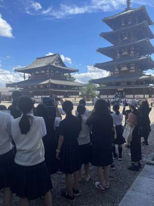 法隆寺に到着しました。ガイドさんのお話を聞きながら五重塔、金堂を見てまわります!