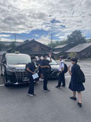 各班タクシーに乗り込み、2日目の見学に向かいます。 タクシーで効率よく京都を巡ります。