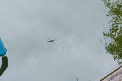 今朝の池の様子、アメンボがスイスイ