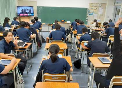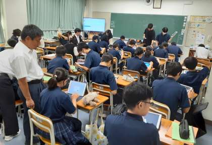 タブレットを活用して、各班が撮影した写真を見ようとしています。見るまでの手順が多くて苦労しているようですね。(副校長)