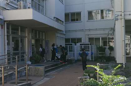 副担任が玄関で生徒の皆さんの登校を迎えています。