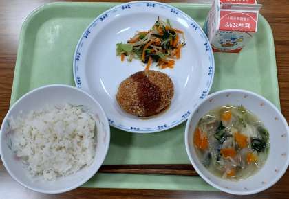 今日のパンプキンコロッケには、豚肉、かぼちゃ、じゃがいも、玉ねぎ、人参が入っています。調理員さん手作りのコロッケは形もとってもきれいです。