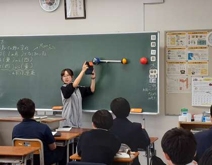 黒板に張り付けた月、地球、太陽の模型とタブレットのカメラ機能を使って地球から、月がどのように見えるのかをモニターに表示していました。