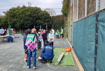けがをした人を担架にのせて運びます。 注意事項を伺ってから人形を運びました。