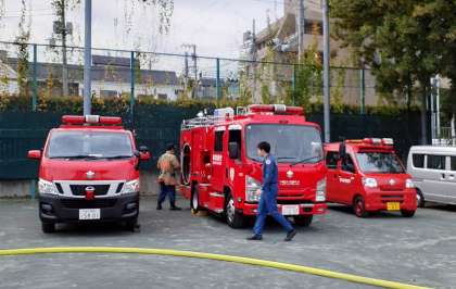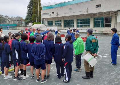 D型ポンプの操作方法を見学しています。 放水の勢いにびっくりしていました。