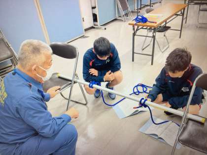 消防署内で、縄の結び方を学んでいる様子です。