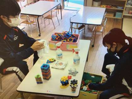 若竹保育園では、おもちゃの消毒作業中ですね。