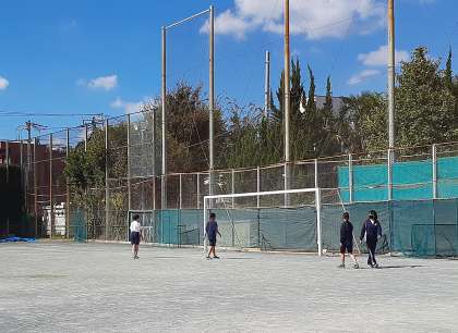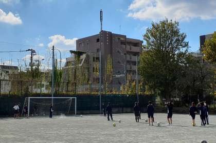 気温が上がって、生徒は暑いと言っています。日陰での休憩を取ったあとはシュート練習。