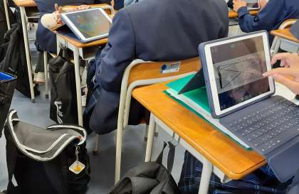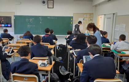 1年生 理科 入射角、反射角 作図の作業をタブレットで行っています。 便利ですね。(副校長)