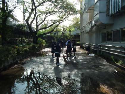 4月24日(火)の早朝7時50分から桜の花びらや花芯の清掃を行いました。桜の花は華やかで美しいのですが、散った花は清掃が大変です。毎年、生徒会主催のボランティア活動で行っていますが、今回は昨年以上の参加者が集まり作業がはかどりました。参加者の皆さん、ありがとうございました。もう1回27日(金)に行いますので、多くの参加を待っています。
