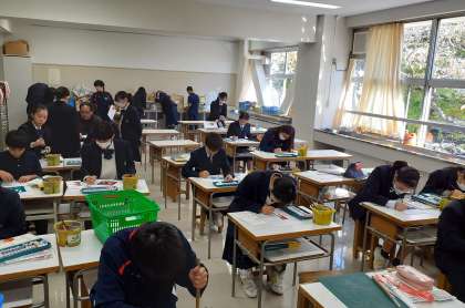 教員は少人数で着色の注意事項を伝えています。(副校長)