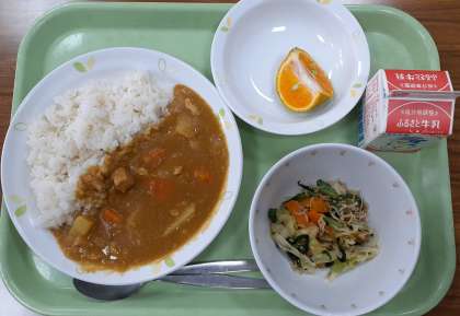 手作りチキンカレーは鶏肉がホロホロでとってもおいしいです。前回給食試食会の時はじゃがいもが多めでしたが今日はちょうどいい分量です。チーズのこくやスパイスが感じられるおいしいカレーです。ご飯には麦が入っています。