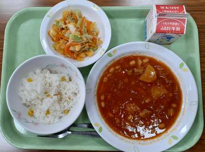 ポークシチューは、豚肉、人参、玉ねぎ、じゃがいも、大豆が入っています。トマトベースのシチューです。