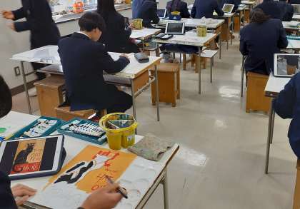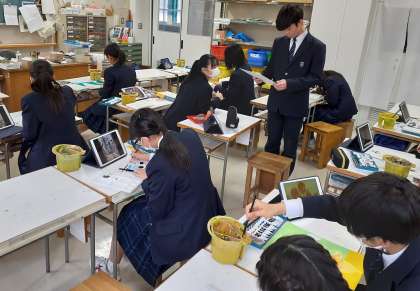 本物の色に近づけようと、色を混ぜています。(副校長)