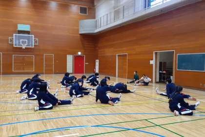 2年生 体育 高跳び 高跳びの前のストレッチ よーく伸ばして 体を暖めて けが防止に大切ですね。(副校長)