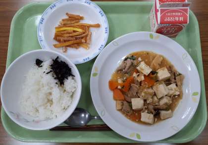肉豆腐は、生姜、にんにくで豚肉をいため、人参、干し椎茸、筍、小松菜、豆腐をガラスープ、酒、しょうゆ、砂糖、赤みそなどで煮込んで、仕上げに長ねぎ、ごま油を入れています。豆腐に味がしみています。デンプンでとろみをつけているので全体がまとまった美味しい一品です。