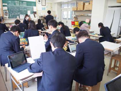 2年の美術の授業は、名画×「漢字」の仕上げでした。制作が終わった人は、苦労した点、改善した点、感想などをまとめて振り返りをしています。