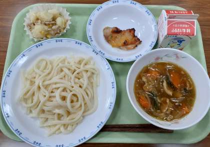 自宅でカレーうどんを作ると具材は豚肉と玉ねぎ、長ねぎだけでおかずはなしのことが多いですが、今日の給食のように多くの品数、具材があると炭水化物の取りすぎも防げるし、満足感が出ますね。ご家庭でも参考になさってください。