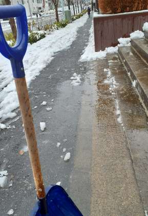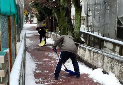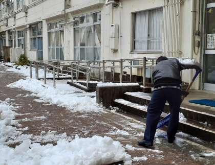 早朝から、主事や教員が雪かきをし、通路の安全を確保しました。(副校長)
