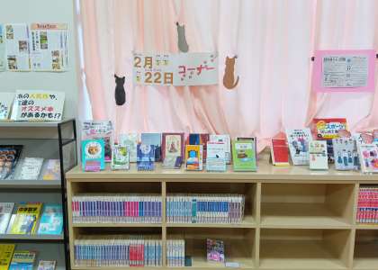 さて、今日は猫の日ですね。図書館には特別コーナーも設置されていますので、昼休みのぞいてみてはいかがでしょうか。