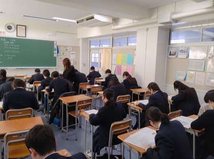 もう一枚は、3時間目の美術の考査中の様子です。授業で習ったことを思い出し、解答しています。