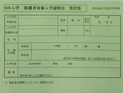 お済みでない方は、ご持参、ご兄弟を通じて、または下北沢小学校の担任の先生を通じて、または郵送にて北沢中学校までご提出をお願いいたします。