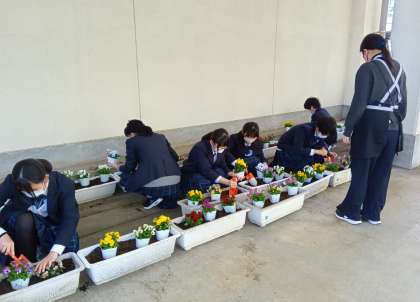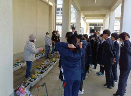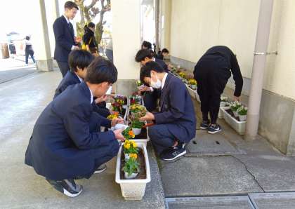 2年生のボランティアの皆さんが冬の間休んでいたプランターにビオラの苗を植えました。