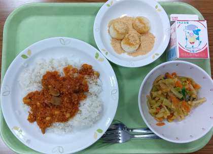 スパイシートマトライスは豚ひき肉、玉ねぎ、にんにく、人参、大豆を炒めてからトマトの水煮を加えて煮ています。チリパウダーやカレー粉も入っていてスパイシーです。大麦入りのご飯にかけていただきます。