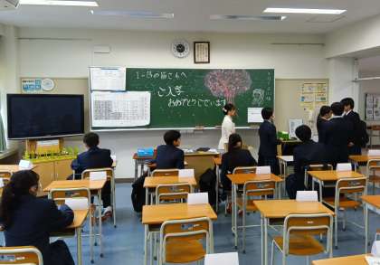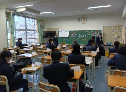 1年生の教室の様子です。 3年生が新入生に入学おめでとうのリボンをつけています。