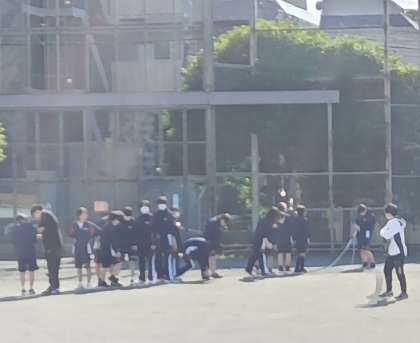 さて、写真は昨日の放課後練習の様子です。1年生が試行錯誤しながら頑張っていますね。放課後練習はクラスごとに、校庭や体育館、北斗館を割当ています。上級生がどのように練習しているのか、コツを参考にするチャンスでもあります。他のクラスを参考にしつつ、自分のクラスに合った跳び方、縄の回し方を見つけてくださいね。(副校長)