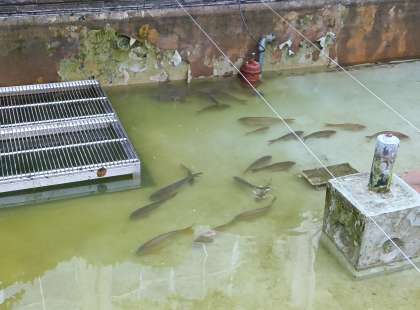 池の掃除が終わりました。 鯉さんたちの姿がよく見えますね。(副校長)