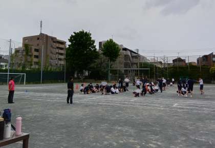 水分補給の後、学級対抗リレーの練習を行います。