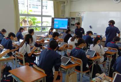 写真は、昨日の国語の授業の様子です。タブレットで課題をまとめ提出しています。(副校長)