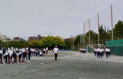 3年生は3クラスなので日頃の体育はC組は単学級で行っています。今日は特別に3クラス合同の体育です。これから学年種目をやるところです。(副校長)