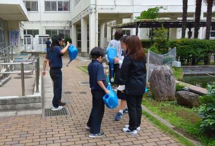 これから水やりをするというときに1年生が2.3年生のじょうろも持ってきました。