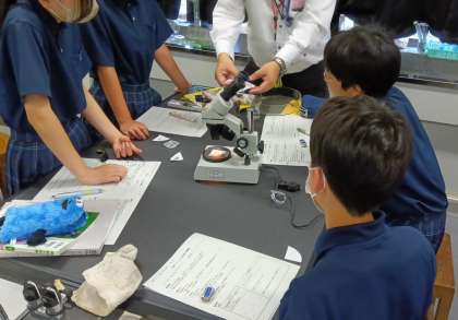 双眼実体顕微鏡で火山灰を観察しています。