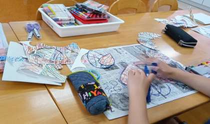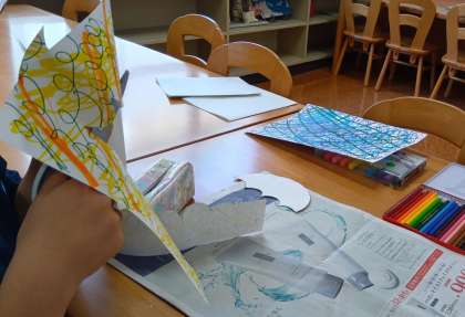 思い思いのペンや色鉛筆を使って線で表現しています。(副校長)