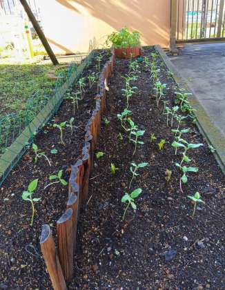 写真は、前回の2年生の花壇ボランティアで植えたひまわりの様子です。雨の日も風の日も、日照りのときも健気に成長する姿に元気をもらっています。(副校長)