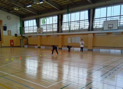 スタッフの方々が本校の体育館にゴールボールのコートを作成中です。楽しみです。(副校長)