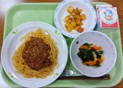 ジャージャー麺は、美味しい蒸し中華麺に、肉味噌をかけていただきます。給食の肉味噌は香味野菜と豚ひき肉、長ねぎ、たけのこ、干ししいたけ、大豆が入っているので栄誉たっぷりです。