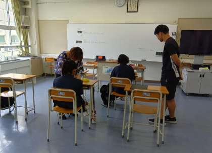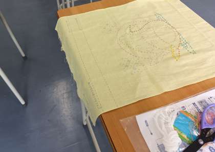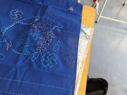 ガイドラインに沿って縫った後は、自分がデザインした模様に挑戦しています。(副校長)