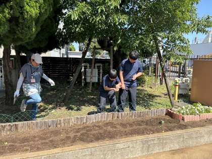 1枚目は6月の花壇ボランティアでひまわりの種を植えているところ、2枚目は今日撮影したひまわりです。