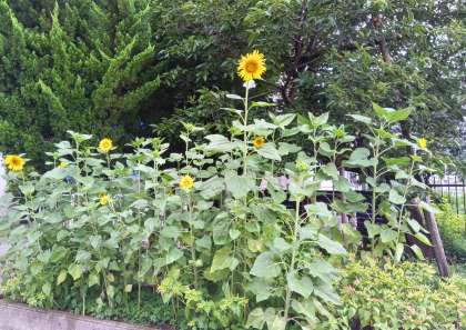 正門では、大きなひまわりが皆さんをお迎えします。(副校長)