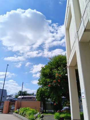 写真は昨日のデイゴと空です。赤と青と白のコントラストがステキです。(副校長)