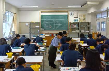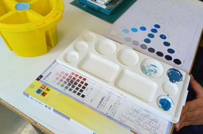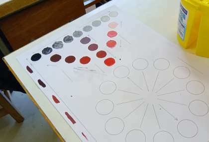 絵の具そのままの色に白、黒の色を混ぜた時にどんな色になるのか実感できますね。(副校長)