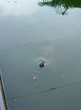 写真は、池の亀さんです。警戒心が強くすぐに隠れてしまいますが、餌やりのときは姿を見せています。(副校長)