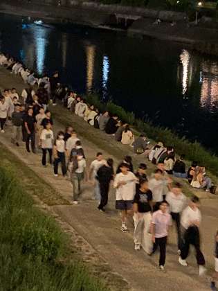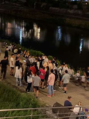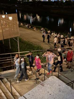 鴨川沿いをナイトウォーク。 外国人旅行客が大勢います。