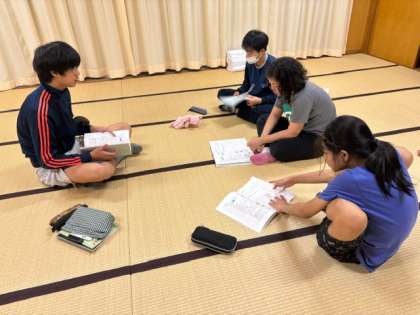 しおりの日記を記入した後、3年生の班長が主体となって班会議を行いました。班長から明日の予定についての確認を1、2年生が真剣に聞いています。